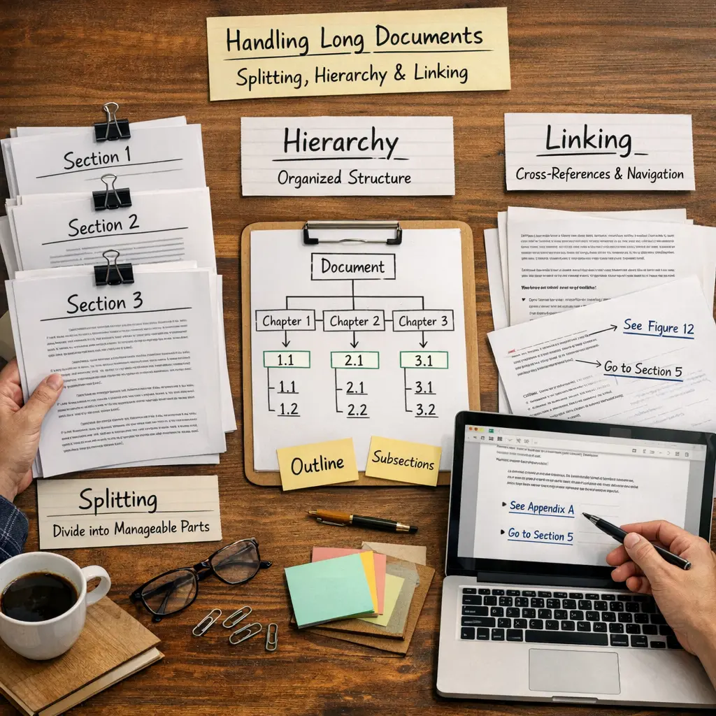 Handling long documents in Retrieval-Augmented Generation (RAG) involves splitting large texts into manageable chunks, organizing them using a hierarchical structure, and linking related sections. This approach improves information retrieval by allowing the system to efficiently search, retrieve, and process relevant segments. Hierarchy maintains context and coherence, while linking ensures seamless navigation between related content, enhancing the overall effectiveness and accuracy of RAG models when dealing with extensive documents.
