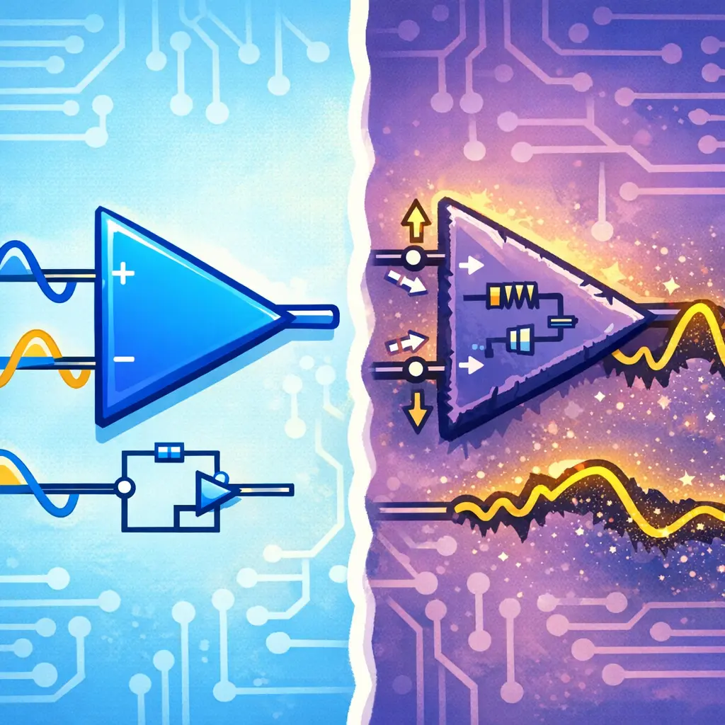 An ideal op-amp has infinite gain, infinite input impedance, zero input current, zero output impedance, and infinite bandwidth. A real op-amp has finite gain, finite input/output impedances, small input bias currents, finite bandwidth, and nonzero offsets.