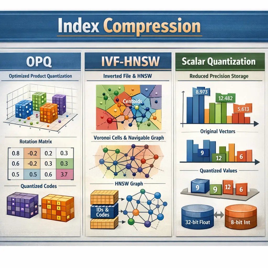 Index compression techniques like OPQ (Optimized Product Quantization), IVF-HNSW (Inverted File with Hierarchical Navigable Small World graphs), and Scalar Quantization are used to efficiently store and search large vector databases in Retrieval-Augmented Generation (RAG) systems. OPQ optimizes vector quantization for compact storage; IVF-HNSW accelerates search by combining inverted indexing with efficient graph-based nearest neighbor search; Scalar Quantization reduces data precision to further compress vectors, all enhancing retrieval speed and scalability.