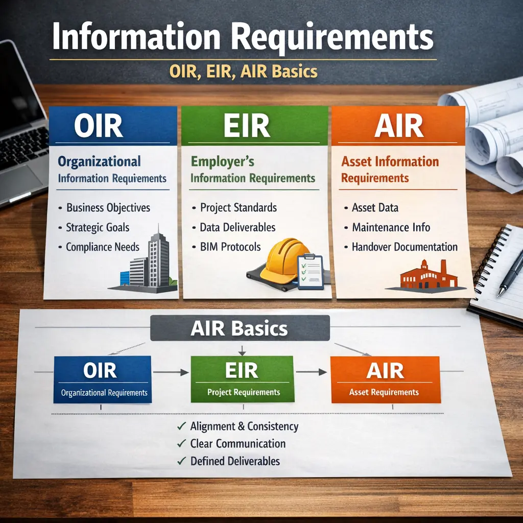 Information Requirements in digital construction refer to the structured needs for project data and documentation. OIR (Organizational Information Requirements) define what an organization needs to operate and manage assets. EIR (Exchange Information Requirements) specify information needed at project milestones for decision-making or asset delivery. AIR (Asset Information Requirements) outline data necessary for asset operation and maintenance. Together, these ensure the right information is delivered at the right time throughout a construction project’s lifecycle.
