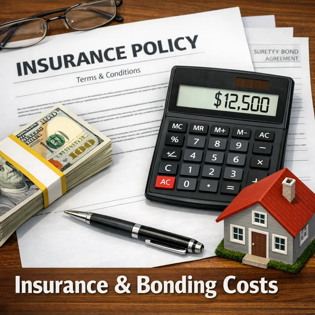 Insurance costs cover risks like injuries or property damage, while bonding costs are premiums for surety bonds that guarantee contract performance or payment to the project owner.