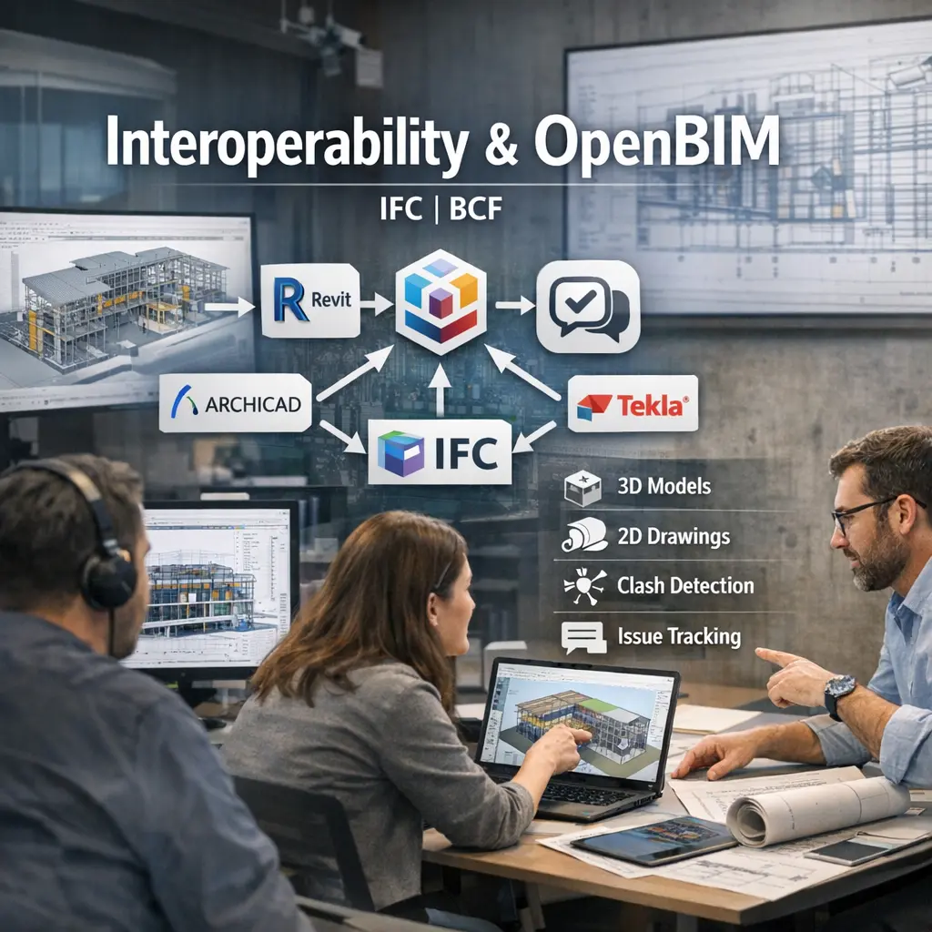 Interoperability is the ability for different BIM tools to exchange and use data—such as models, properties, and schedules—without losing meaning or detail.