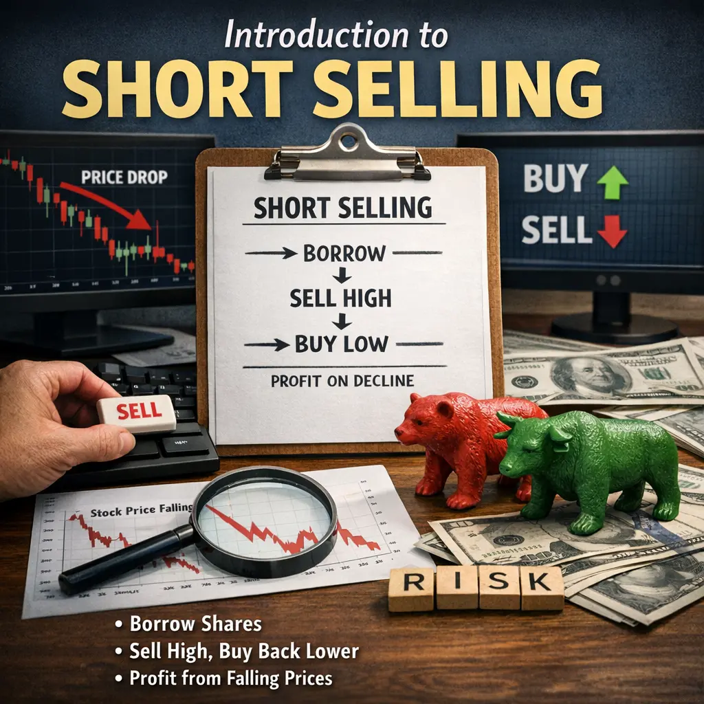 Short selling is selling shares you don’t own by borrowing them, with the plan to buy them back later. You aim to profit if the price falls, but it requires a margin account and borrowing shares.