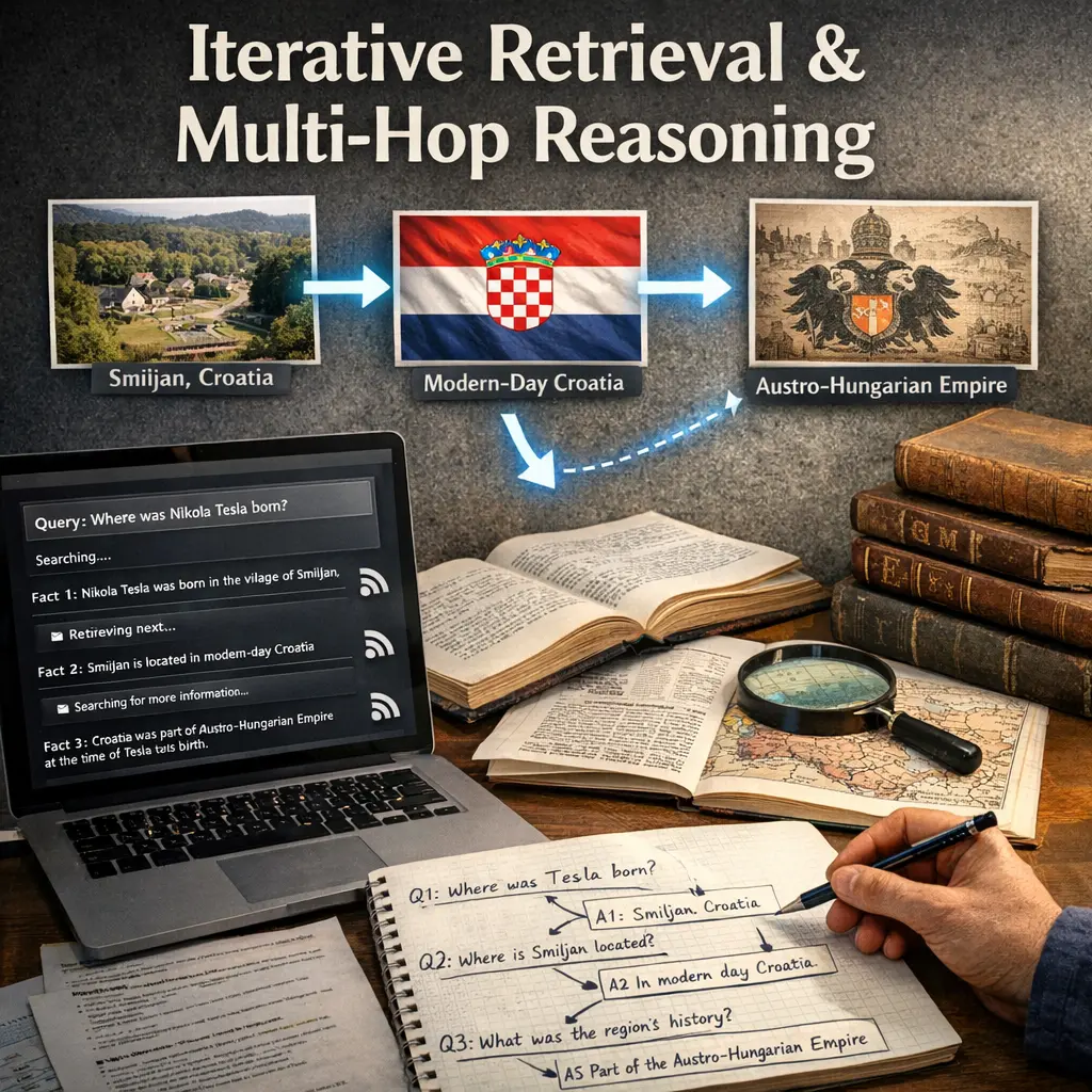 Iterative Retrieval & Multi-Hop Reasoning are advanced Retrieval-Augmented Generation (RAG) techniques that enhance information extraction and synthesis. Iterative retrieval involves repeatedly querying a knowledge base, refining search results at each step. Multi-hop reasoning enables models to connect information across multiple documents or sources, piecing together complex answers that require several inference steps. Together, these techniques allow AI systems to tackle more sophisticated queries that demand deep understanding and integration of dispersed information.