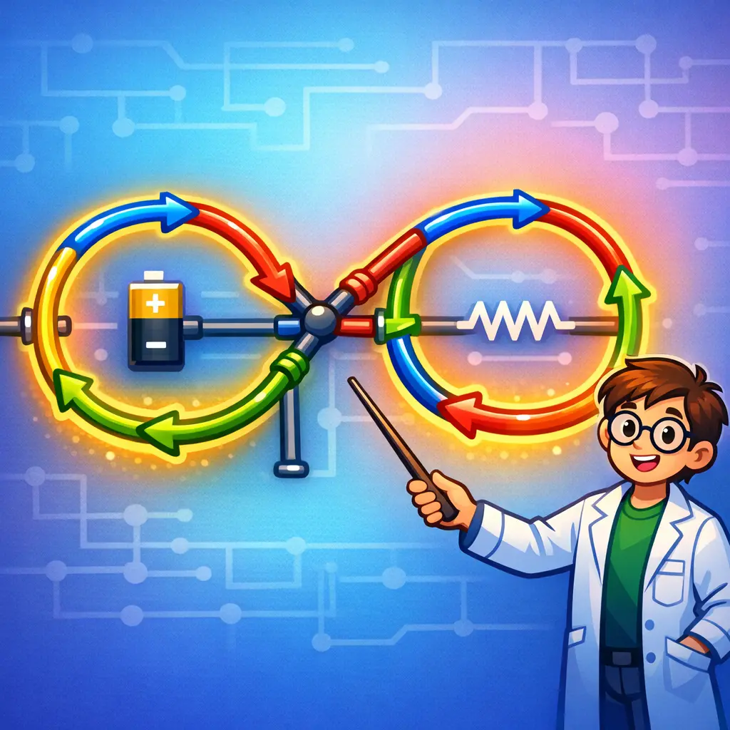 Choose a loop and a traversal direction, then sum the voltages around the loop with consistent signs (drops minus rises). The total must be zero.