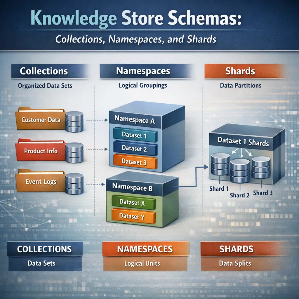 Knowledge Store Schemas in Retrieval-Augmented Generation (RAG) organize data using collections, namespaces, and shards. Collections group related documents, namespaces provide logical separation within the data, and shards divide large datasets for efficient storage and retrieval. This schema structure enables scalable, organized, and efficient access to knowledge sources, ensuring that retrieval processes in RAG systems are both fast and contextually relevant.