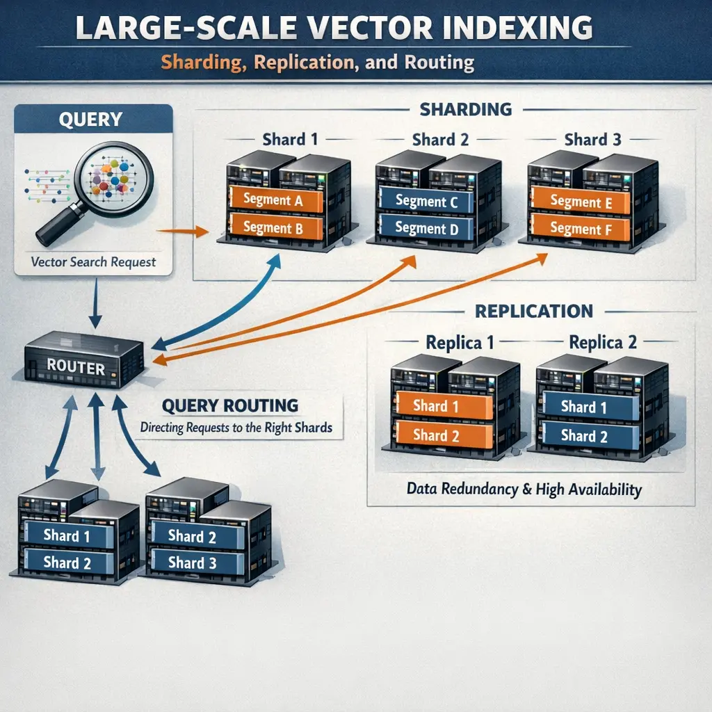 Large-scale vector indexing involves organizing vast collections of vector embeddings to enable efficient similarity search, crucial for Retrieval-Augmented Generation (RAG) systems. Sharding divides the dataset into manageable partitions distributed across multiple nodes, while replication creates copies to enhance fault tolerance and availability. Routing determines how queries are directed to the appropriate shard or replica, ensuring fast and accurate retrieval of relevant information. Together, these techniques enable scalable, reliable, and high-performance retrieval in RAG applications.