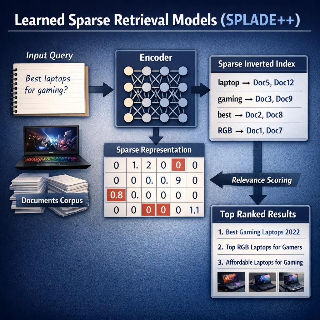 Learned Sparse Retrieval Models (SPLADE++) are advanced retrieval-augmented generation (RAG) techniques that transform input text into sparse, high-dimensional vectors using neural networks. Unlike dense retrieval, SPLADE++ maintains interpretability and efficiency by activating only relevant vocabulary dimensions, enabling effective matching between queries and documents. This approach combines the strengths of traditional sparse methods (like BM25) with deep learning, resulting in improved retrieval accuracy and scalability for large-scale information retrieval tasks.