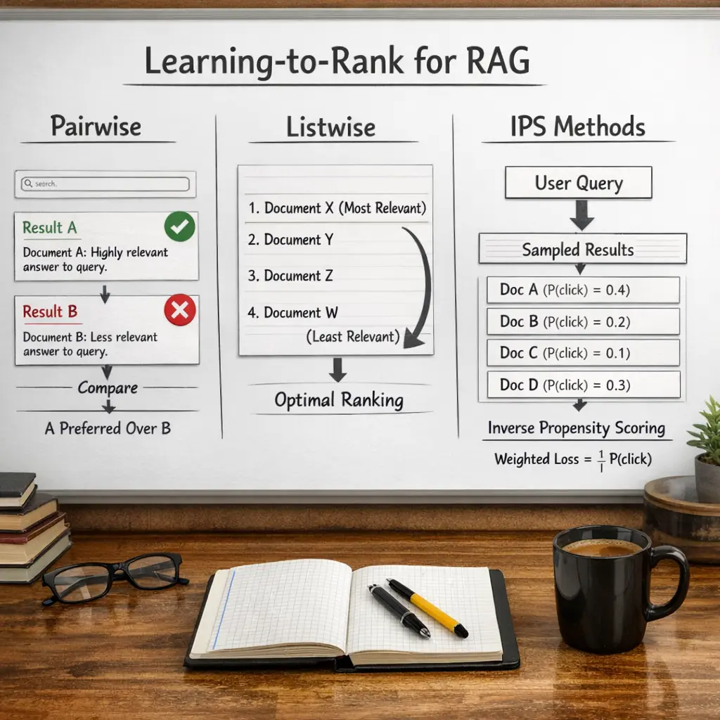 Learning-to-Rank for Retrieval-Augmented Generation (RAG) refers to optimizing how retrieved documents are ranked before being fed to a generative model. Pairwise methods compare document pairs to determine which is more relevant, while listwise methods consider the entire set of retrieved documents to optimize their overall ordering. Inverse Propensity Scoring (IPS) methods adjust for bias in training data, ensuring more accurate ranking. These approaches improve the relevance and quality of information provided to RAG systems.