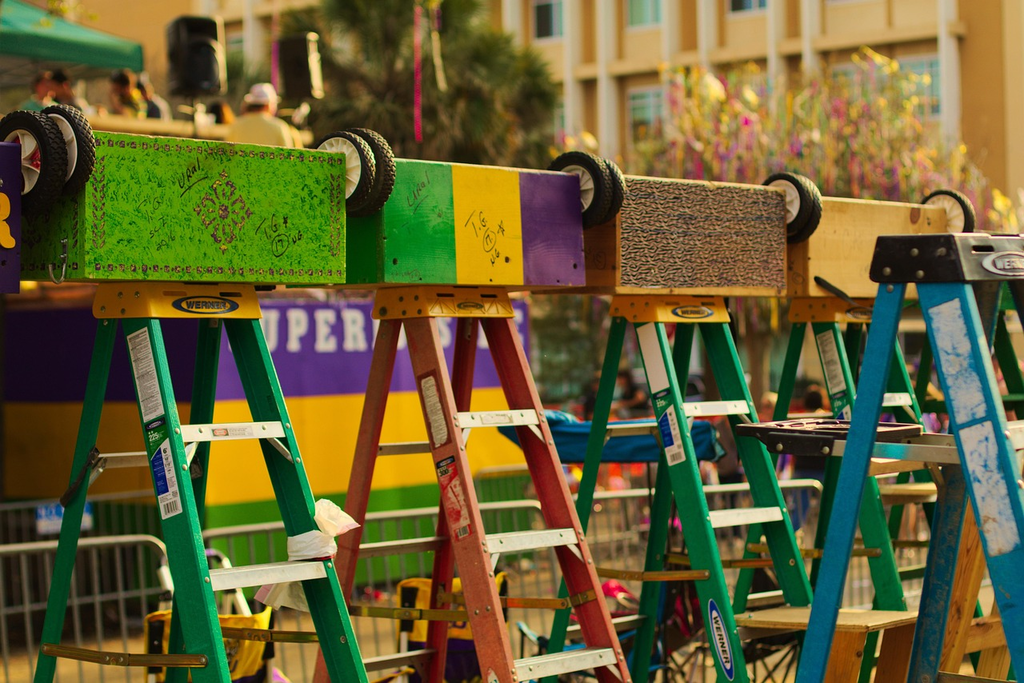 Beads thrown from floats, grand parades organized by krewe groups, masquerade balls, and King Cake are iconic elements.