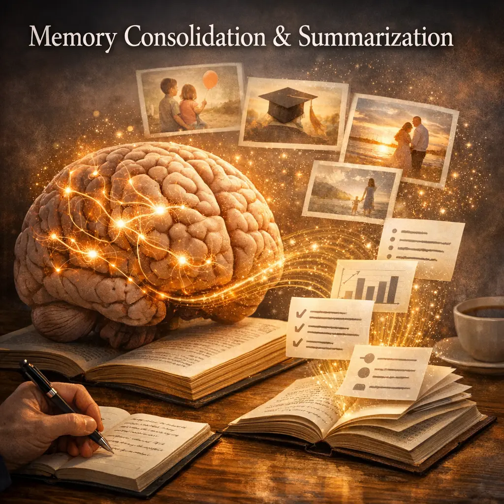 Memory Consolidation & Summarization in agent architecture refers to processes where an AI system organizes, compresses, and integrates newly acquired information into its long-term memory. This involves distilling detailed experiences or data into concise summaries, retaining essential knowledge while discarding less relevant details. The goal is to enhance the agent’s learning efficiency, recall, and reasoning by maintaining a manageable and meaningful memory structure that supports future decision-making and problem-solving.