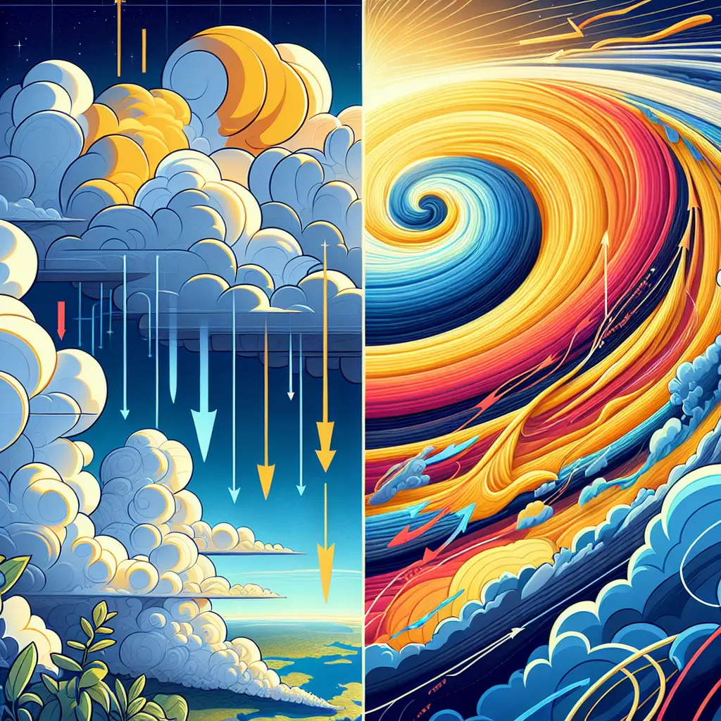 Mesoscale systems are weather phenomena ranging from a few kilometers to several hundred kilometers, such as thunderstorms or sea breezes, and typically last from minutes to several hours. Synoptic scale systems, like mid-latitude cyclones or large high-pressure areas, span hundreds to thousands of kilometers and persist for days. The primary difference lies in their spatial and temporal scales, with mesoscale systems being smaller and shorter-lived compared to the broader, longer-lasting synoptic scale systems.