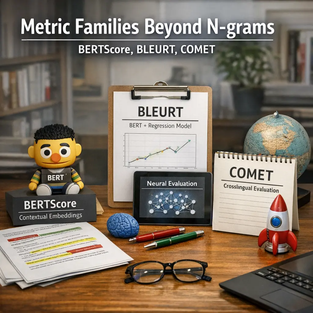 Metric families beyond n-grams, such as BERTScore, BLEURT, and COMET, represent advanced evaluation methods for language models. Unlike traditional n-gram metrics that rely on surface-level word overlaps, these metrics leverage deep learning and contextual embeddings to assess semantic similarity and meaning. They provide more nuanced and accurate evaluations of text generation, making them valuable tools for Large Language Model (LLM) evaluations and improving the assessment of natural language understanding and generation tasks.