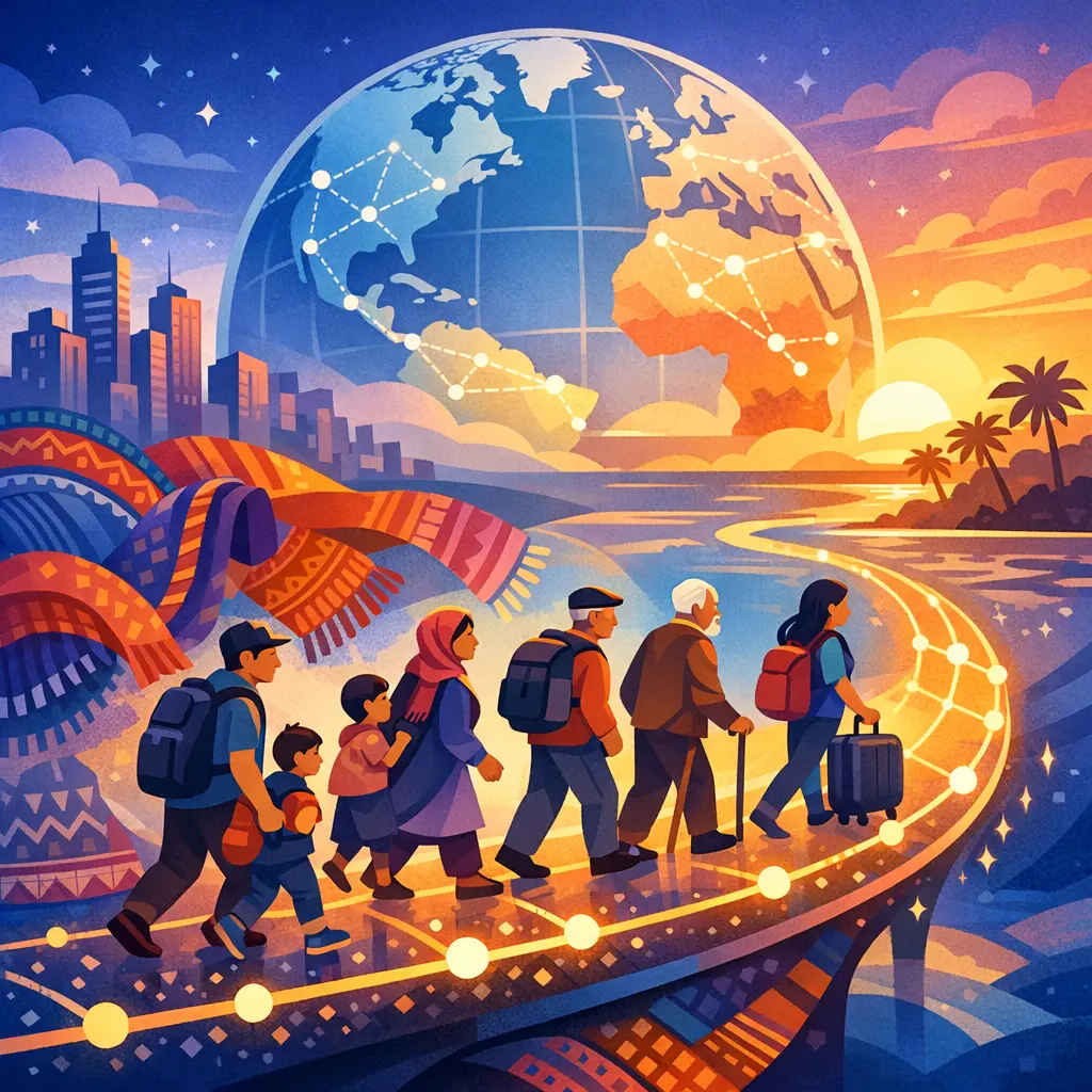 Migration, diaspora, and identity explore how the movement of people across borders shapes cultural, religious, and social identities. Migration leads to the formation of diasporas—communities living outside their ancestral homelands—who maintain cultural and religious traditions while adapting to new societies. This dynamic process influences individual and collective identities, fostering hybrid cultures, negotiating belonging, and redefining relationships between home and host societies within broader cultural and social frameworks.
