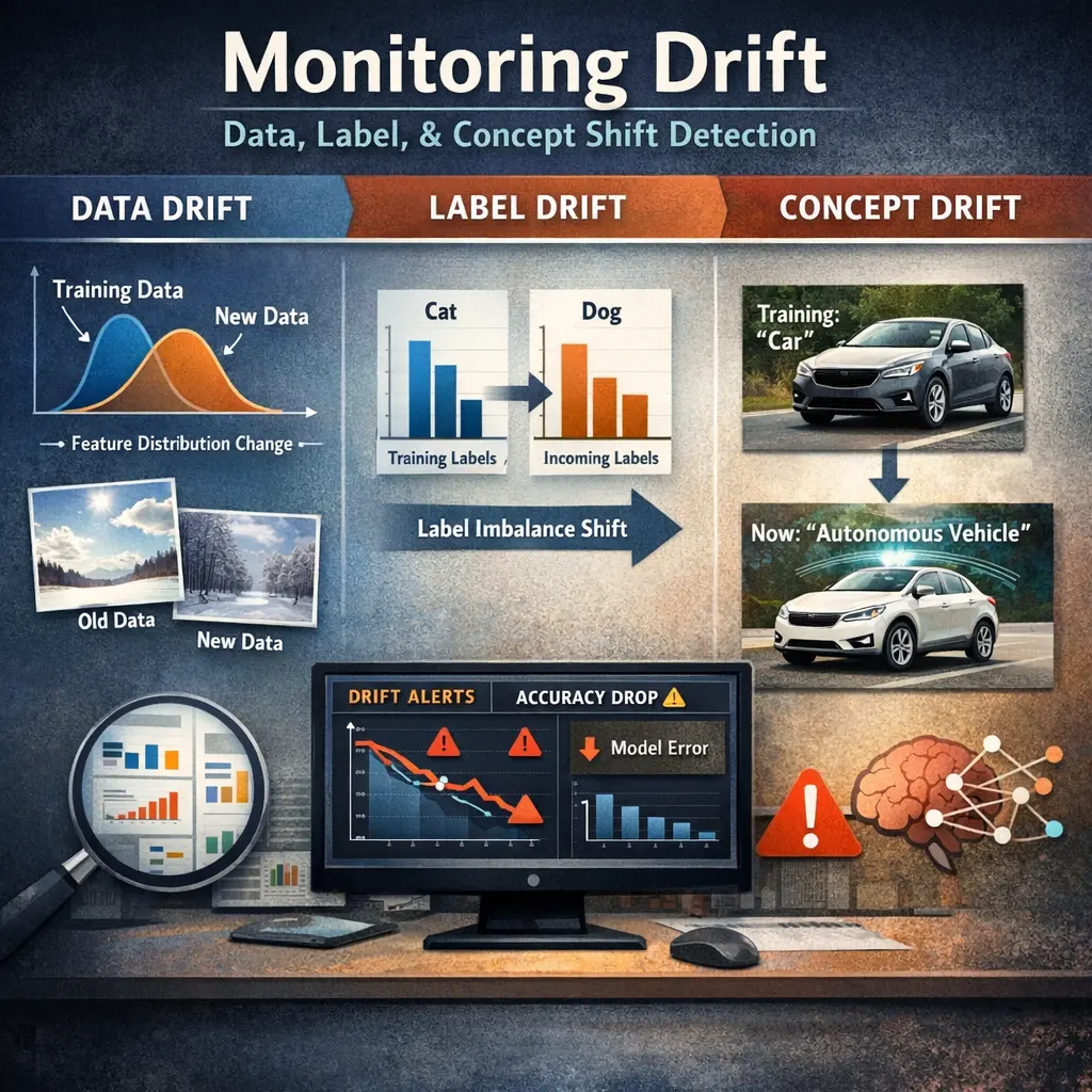 What is data drift, label drift, and concept drift, and how do they differ?