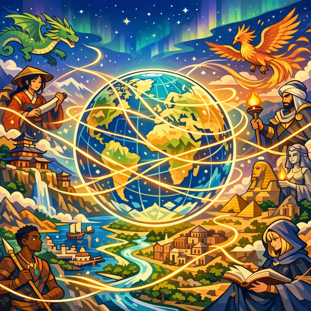 Mythopoesis, worldbuilding, and global narratives refer to the creative processes by which cultures construct imaginative worlds, stories, and mythologies. These practices shape collective identities, values, and beliefs, influencing culture, religion, and society. Through myth-making and narrative construction, societies articulate worldviews, explain origins, and establish social norms, fostering shared meaning and cohesion. Global narratives further connect diverse cultures, facilitating cross-cultural understanding and the evolution of collective human experience.