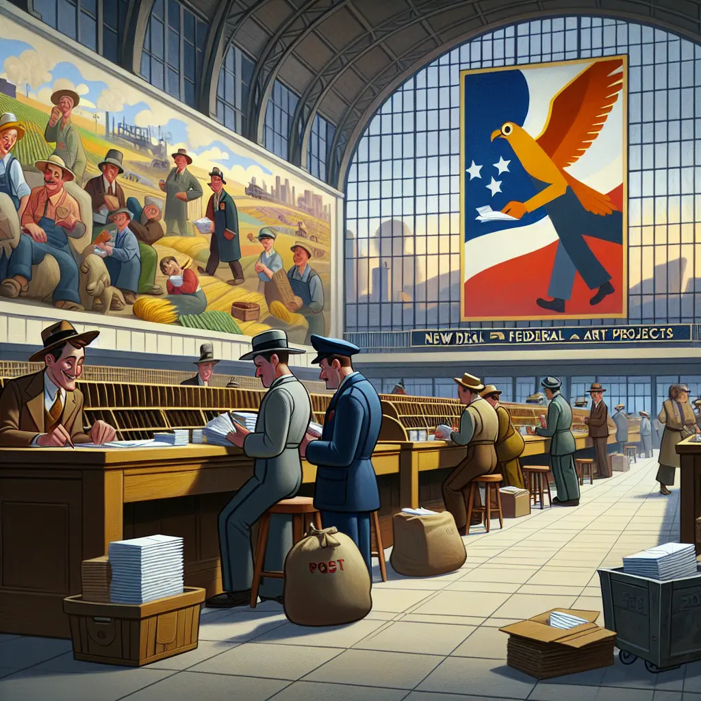 The New Deal Post Office Murals and Federal Art Programs were initiatives launched during the 1930s in the United States to provide employment for artists during the Great Depression. These programs, such as the Treasury Section of Painting and Sculpture, commissioned artists to create murals and artworks in public buildings, especially post offices. The resulting murals depicted American life, history, and landscapes, making art accessible to the public and supporting cultural enrichment across the nation.