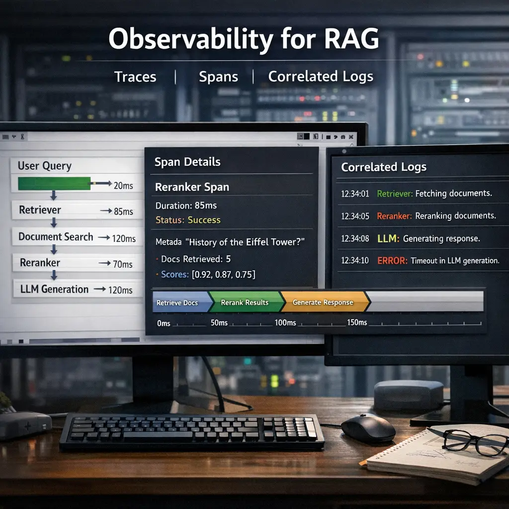 Observability for RAG involves monitoring and analyzing the end-to-end workflow of Retrieval-Augmented Generation systems. Using traces and spans, engineers can track each step—such as document retrieval and response generation—within a request. Correlated logs provide detailed, contextual information about events and errors as they occur. Together, these tools help diagnose issues, optimize performance, and ensure reliability by making complex interactions within RAG pipelines transparent and understandable.