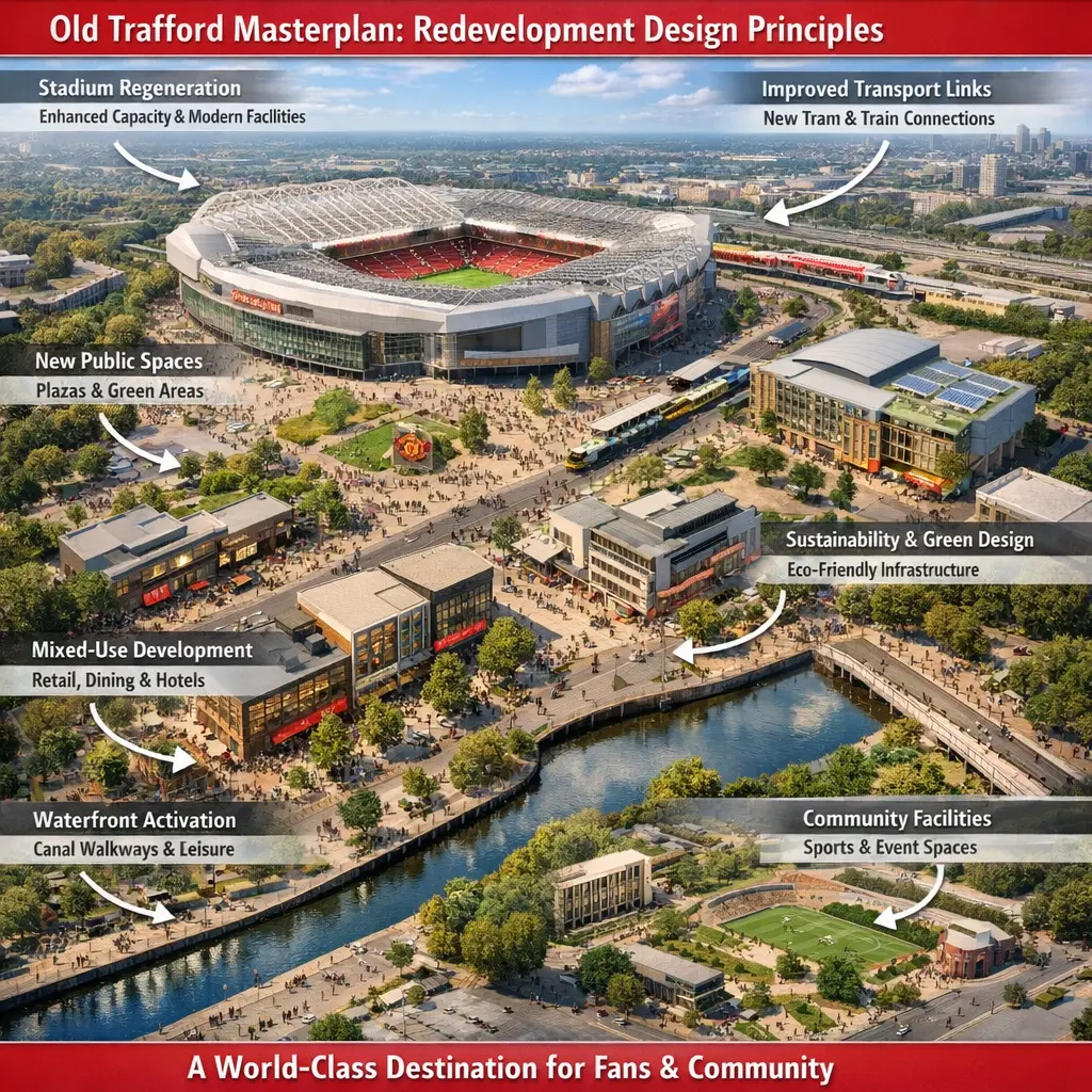 The "Old Trafford Masterplan: Redevelopment Design Principles" refers to Manchester United F.C.'s strategic approach for modernizing and expanding their iconic stadium. It focuses on enhancing spectator experience, increasing capacity, improving accessibility, and integrating sustainable practices. The plan emphasizes preserving the stadium’s historic character while introducing state-of-the-art facilities, better transport links, and community engagement. Overall, it aims to secure Old Trafford’s status as a world-class, future-ready sports venue.