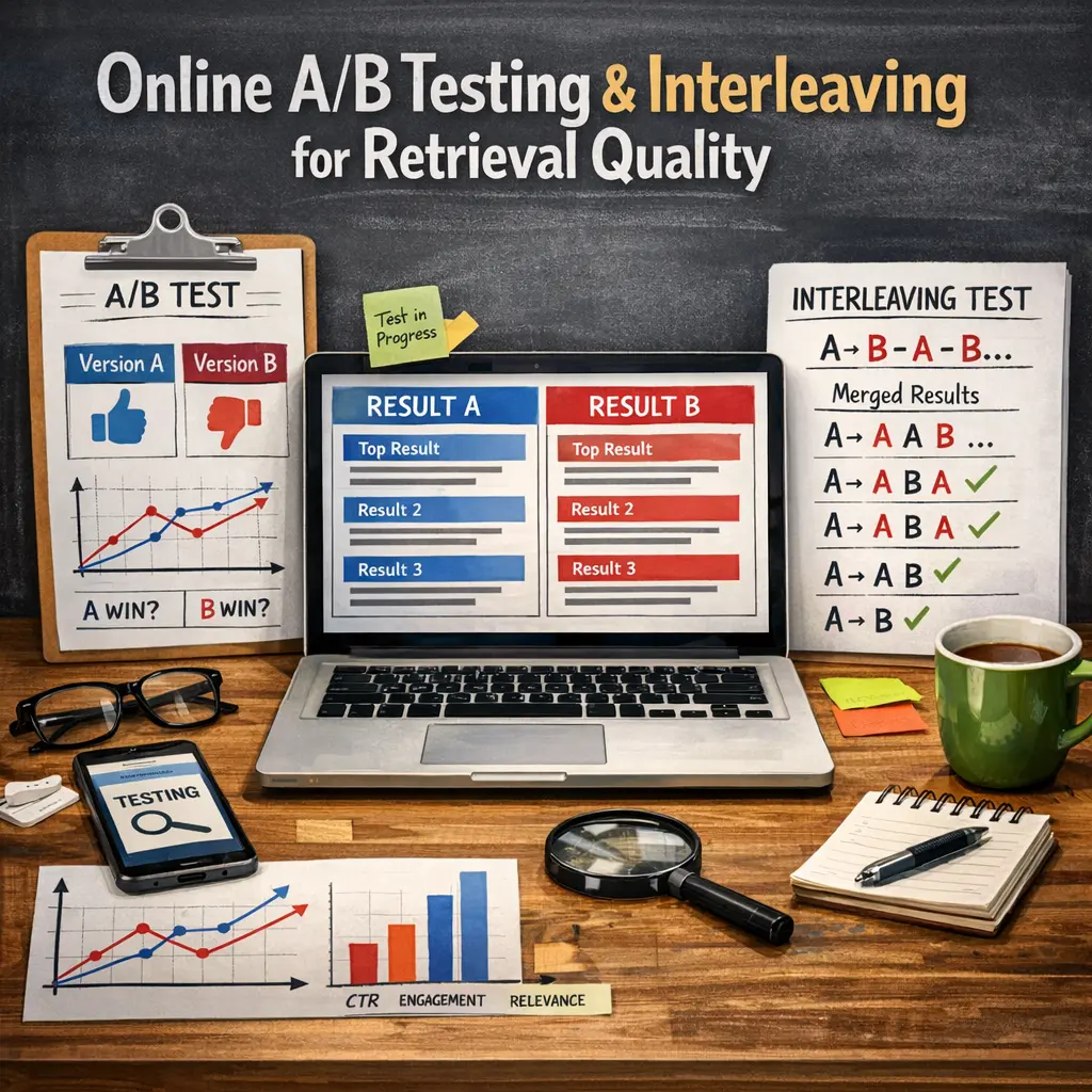 Online A/B testing and interleaving are experimental techniques used to evaluate and compare the effectiveness of different retrieval models in Retrieval-Augmented Generation (RAG) systems. A/B testing exposes users to different system versions to measure performance differences, while interleaving mixes results from multiple models within a single interaction, allowing for more sensitive, user-centric comparisons. These methods help optimize retrieval quality, ensuring RAG systems provide more relevant and accurate information to users.