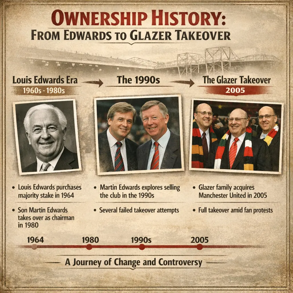 It traces who owned the club over time, highlighting major transitions such as the Edwards era and the Glazer takeover.