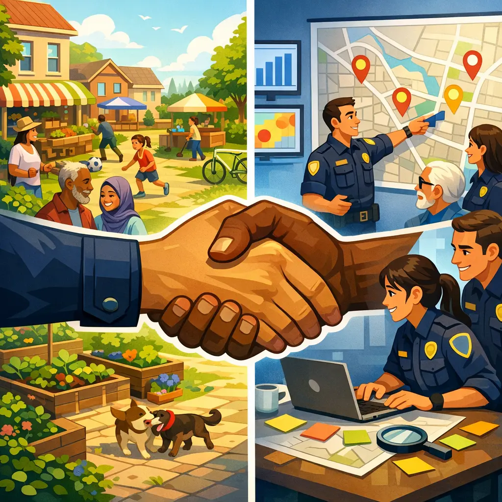 A policing approach that emphasizes building ongoing relationships with the community, partnerships with residents and organizations, and proactive problem solving to prevent crime and improve quality of life.