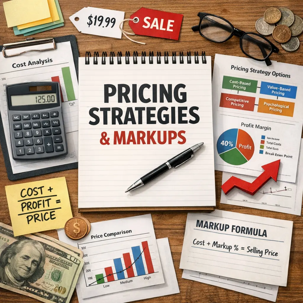 Markup is the amount added to cost to set the selling price. Markup = Price − Cost; Markup% = (Price − Cost) / Cost × 100%. Margin differs: Margin = (Price − Cost) / Price.