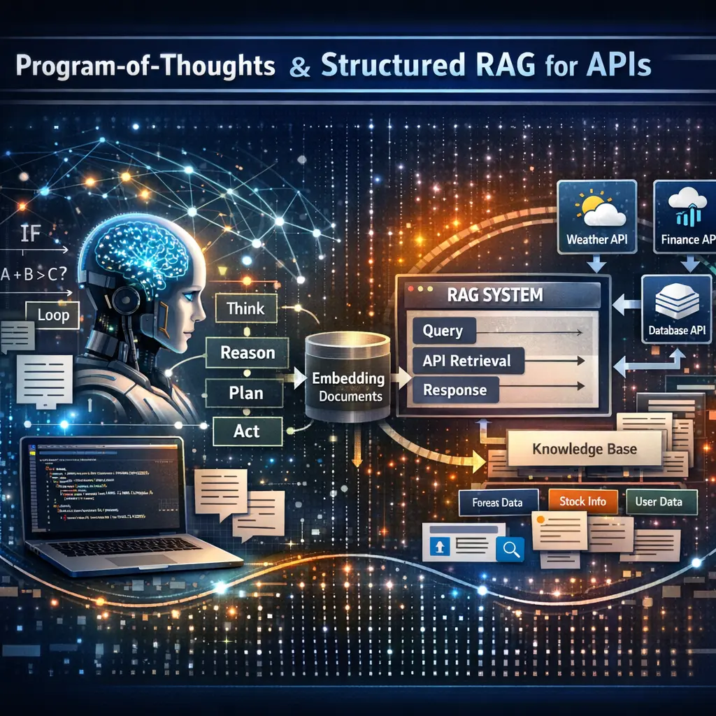 Program-of-Thoughts and Structured RAG for APIs refers to an advanced approach in Retrieval-Augmented Generation (RAG) where the reasoning process is broken down into structured, step-by-step “thoughts” or sub-tasks. This method enhances API interactions by retrieving relevant information and organizing it logically, allowing large language models to generate more accurate, coherent, and context-aware responses, especially for complex queries that require multiple reasoning or retrieval steps.