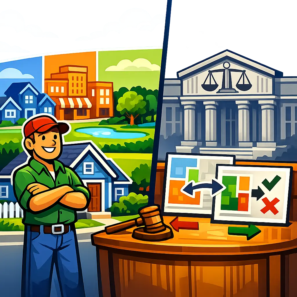 Zoning divides land into districts with permitted uses and standards (density, setbacks, height) to guide development and protect health, safety, and welfare.