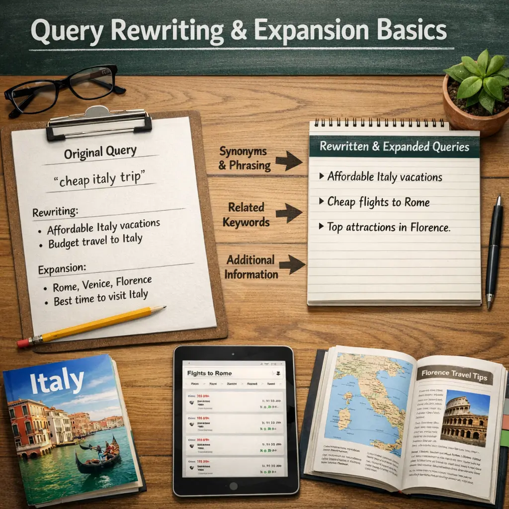 Query rewriting and expansion are advanced Retrieval-Augmented Generation (RAG) techniques that enhance information retrieval by reformulating or broadening user queries. Query rewriting involves rephrasing or clarifying the original query to improve search relevance, while expansion adds related terms or concepts to capture more pertinent results. These methods help RAG systems retrieve more accurate and comprehensive information, ultimately improving the quality and context of generated responses in complex question-answering scenarios.
