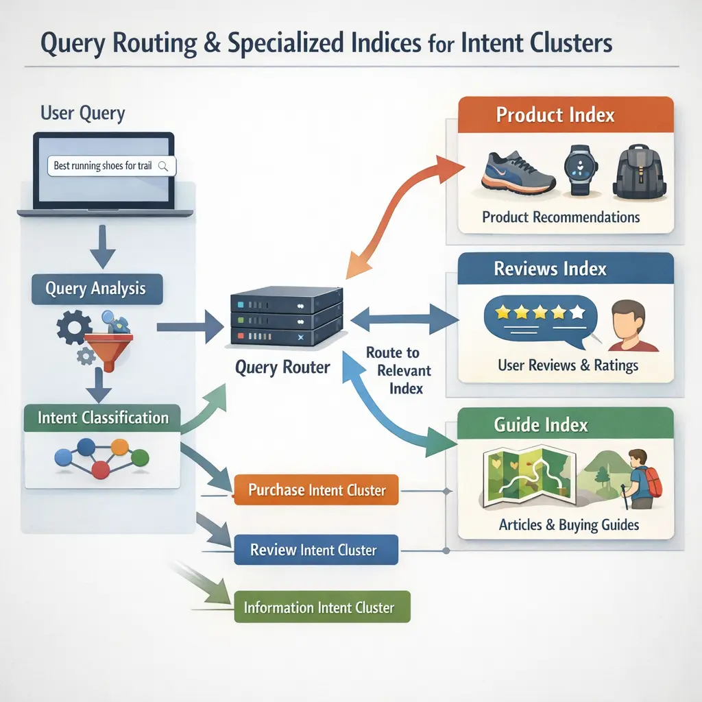 The system infers the query's intent cluster, selects the matching specialized index, and routes the query there to retrieve targeted results.