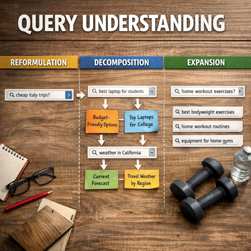 Query Understanding involves interpreting user queries to improve information retrieval. Reformulation rewrites queries for clarity or intent, decomposition breaks complex queries into simpler sub-queries, and expansion adds related terms to enhance results. In Retrieval-Augmented Generation (RAG), these techniques help models fetch relevant external data, ensuring more accurate and contextually appropriate responses by aligning user intent with retrieved information and generated answers.