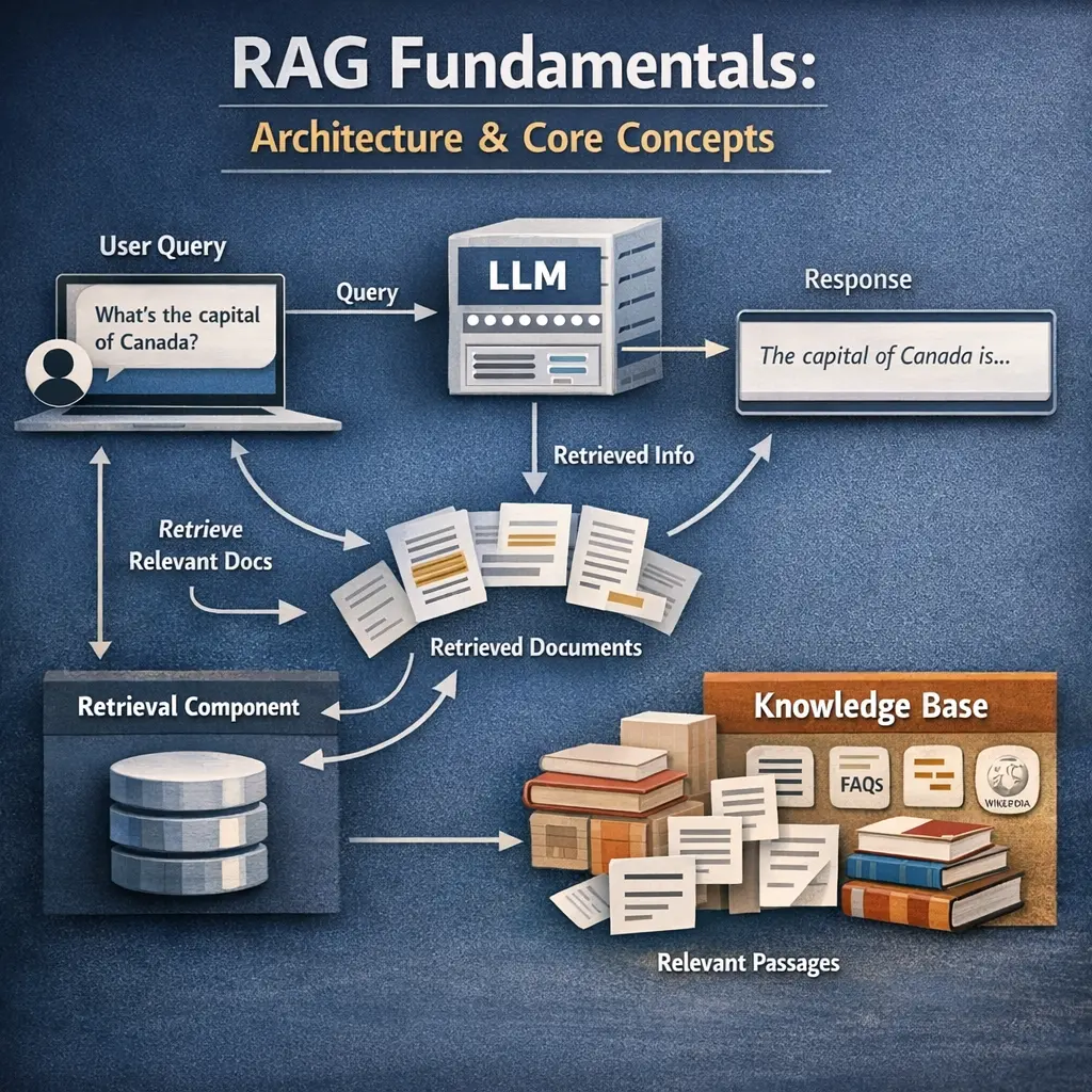 RAG Fundamentals: Architecture & Core Concepts refer to the foundational elements of Retrieval-Augmented Generation (RAG), an AI framework that combines retrieval and generation. In RAG, a retriever fetches relevant documents from a large corpus, and a generator, typically a language model, synthesizes responses using both the retrieved information and its own knowledge. This hybrid approach enhances accuracy, relevance, and factual grounding in generated outputs, making RAG valuable for tasks like question answering and summarization.