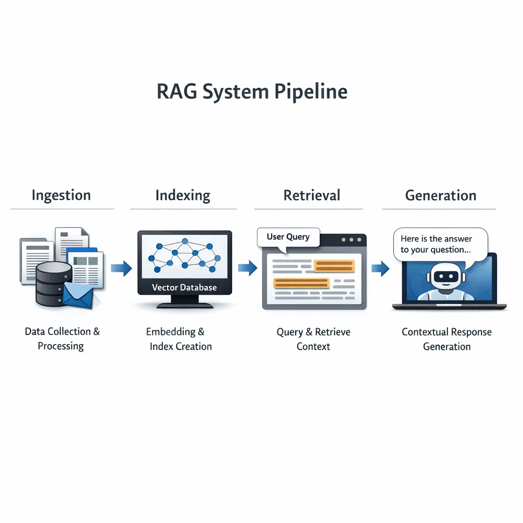 The RAG System Pipeline is a process used in Retrieval-Augmented Generation models. It involves four key stages: Ingestion, where data is collected and processed; Indexing, where the data is organized for efficient searching; Retrieval, where relevant information is fetched in response to a query; and Generation, where an AI model combines retrieved data with its own capabilities to create accurate, context-rich responses. This approach enhances the quality and relevance of generated outputs.