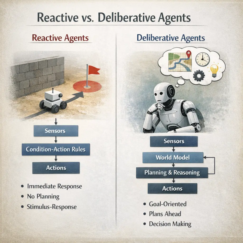 Reactive agents respond immediately to percepts with rules; deliberative agents generate and evaluate plans before acting.