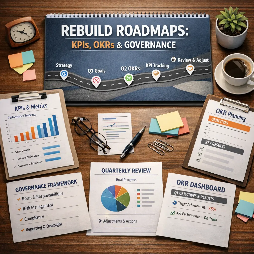 "Rebuild Roadmaps: KPIs, OKRs, and Governance (Manchester United F.C.)" refers to the structured process of revitalizing Manchester United’s strategic direction. It involves setting clear Key Performance Indicators (KPIs) and Objectives and Key Results (OKRs) to measure progress and success. Additionally, it emphasizes establishing robust governance frameworks to ensure accountability, transparency, and alignment across all club operations, ultimately aiming to restore Manchester United’s competitive edge and organizational excellence.