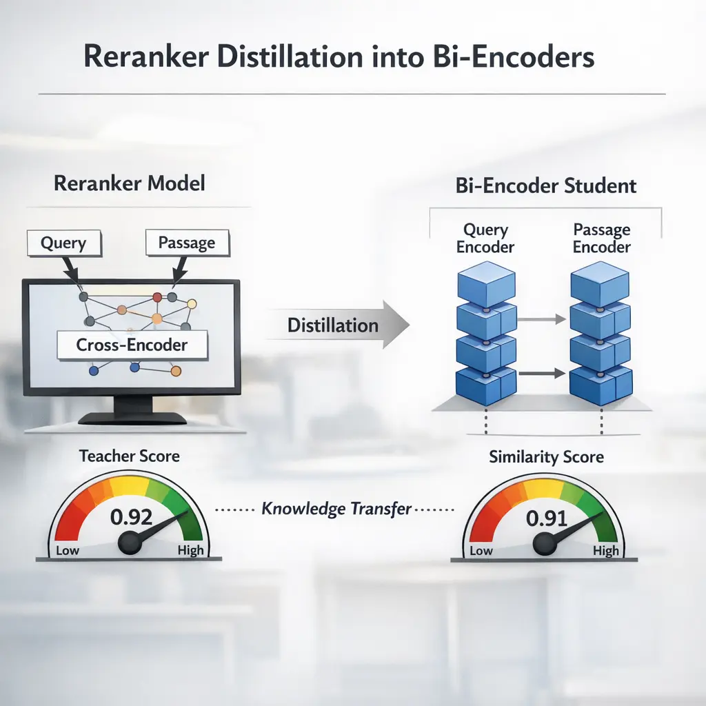 Reranker Distillation into Bi-Encoders is an advanced Retrieval-Augmented Generation (RAG) technique where a powerful reranker model’s knowledge is transferred into a bi-encoder system. Traditionally, bi-encoders are efficient but less accurate than cross-encoders or rerankers. By distilling the reranker’s judgments into the bi-encoder’s training, this method improves retrieval quality while maintaining the speed and scalability of bi-encoders, enhancing overall RAG performance for tasks like question answering or document retrieval.