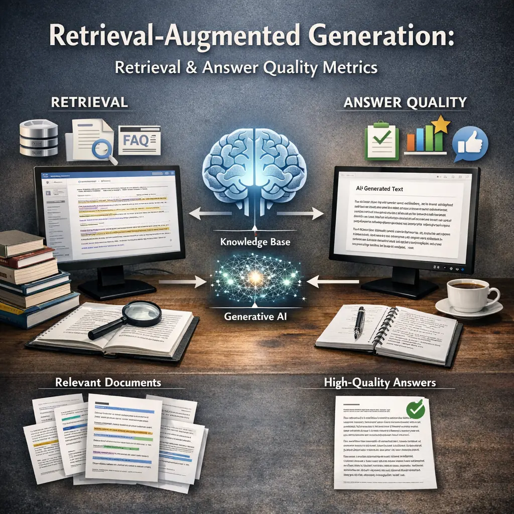 Retrieval quality is typically measured with metrics like recall@k (whether a relevant document is in the top-k results), precision@k, and mean reciprocal rank (MRR).