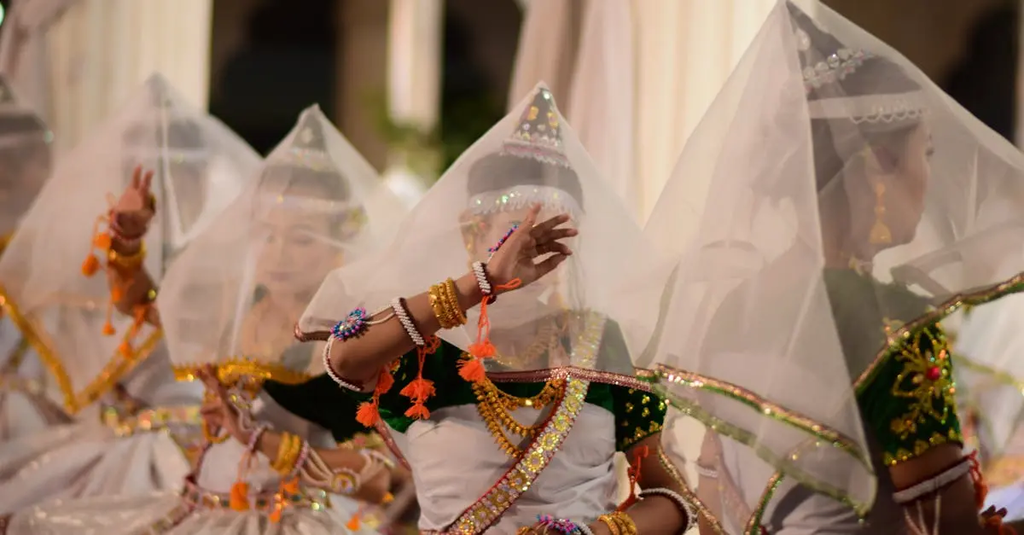 Opulent costumes and production design, grand song-and-dance sequences, and a dramatic, emotional score supporting romance and tragedy.