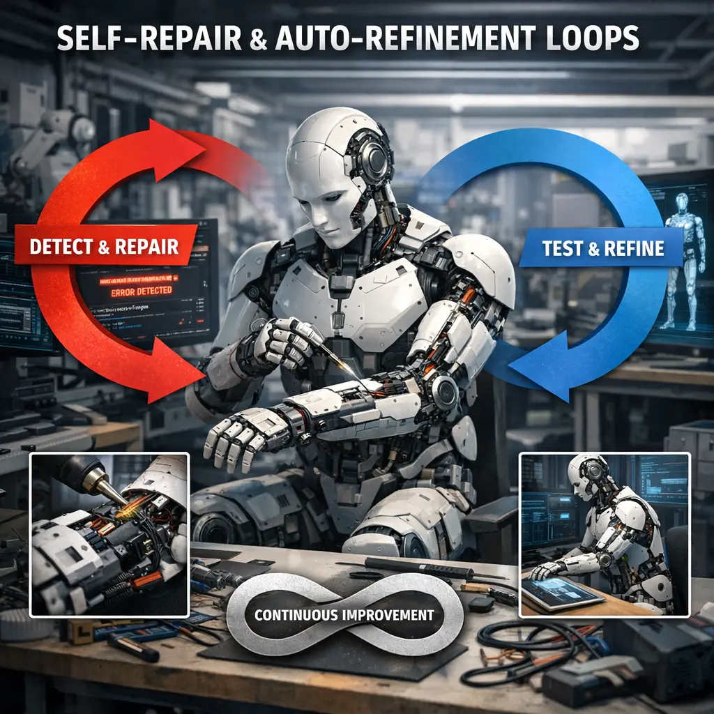 Self-Repair & Auto-Refinement Loops in agent architecture refer to mechanisms that enable an AI system to detect errors, inconsistencies, or inefficiencies in its own processes or outputs and autonomously correct or improve them. Through iterative feedback loops, the agent continually monitors its performance, diagnoses issues, and refines its strategies or knowledge base. This enhances reliability, adaptability, and long-term learning, allowing the agent to function more robustly in dynamic or unpredictable environments.