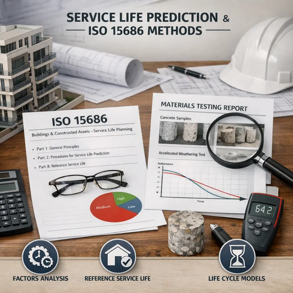 Service Life Prediction involves estimating how long a building material or component will perform its intended function before needing replacement. ISO 15686 is an international standard that provides methods and guidelines for predicting and assessing the service life of building elements. These methods use scientific principles, material data, and environmental factors to ensure durability, optimize maintenance, and support sustainable construction practices by enabling more accurate life-cycle planning and resource management.