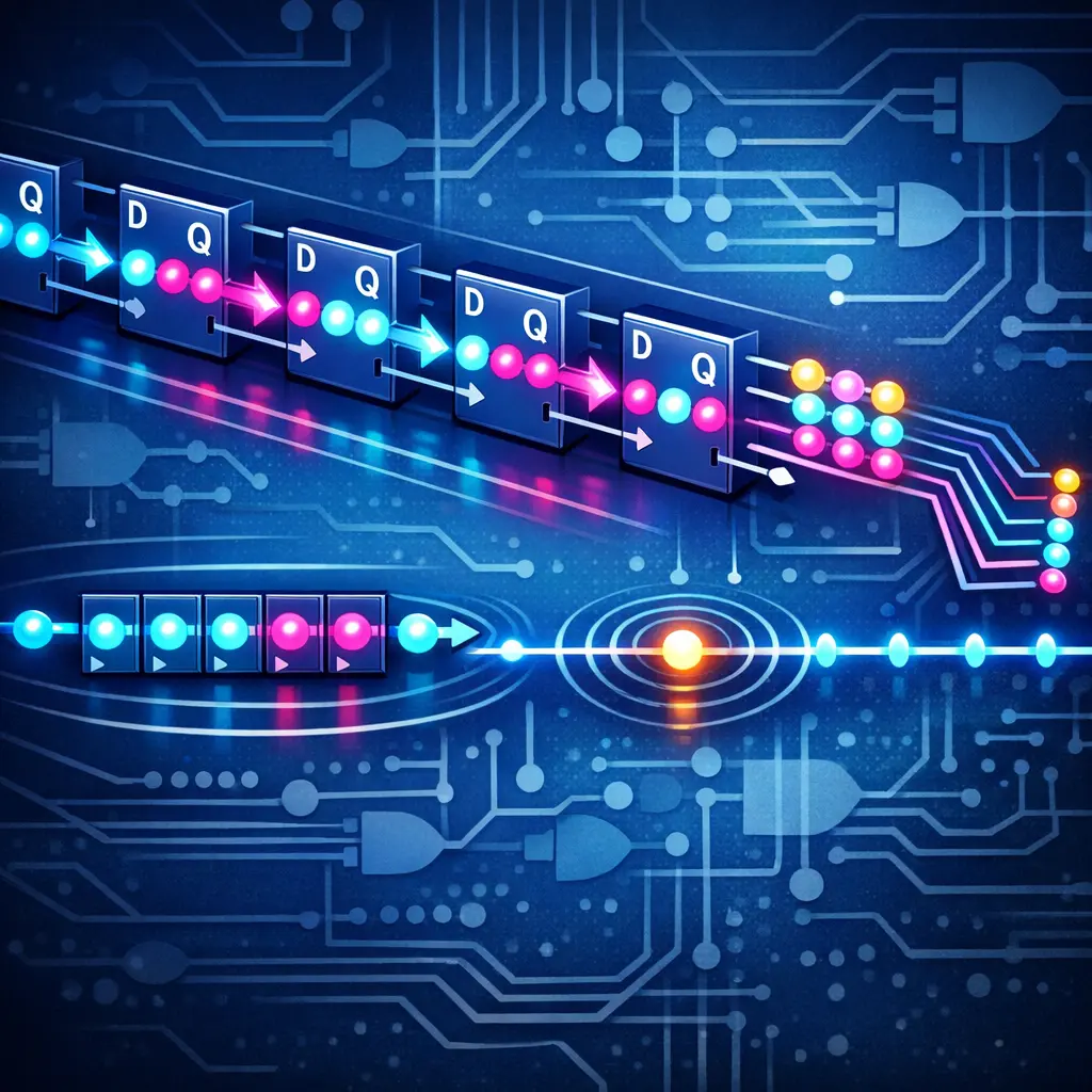 Shift registers are sequential digital circuits used to store and transfer data bits in a linear sequence, either left or right, under clock control. They consist of flip-flops connected in series, enabling data movement and temporary storage. In digital electronics and computing, shift registers are essential for data manipulation, serial-to-parallel or parallel-to-serial data conversion, time delay implementation, and as memory elements in devices like microprocessors, communication systems, and digital signal processing.