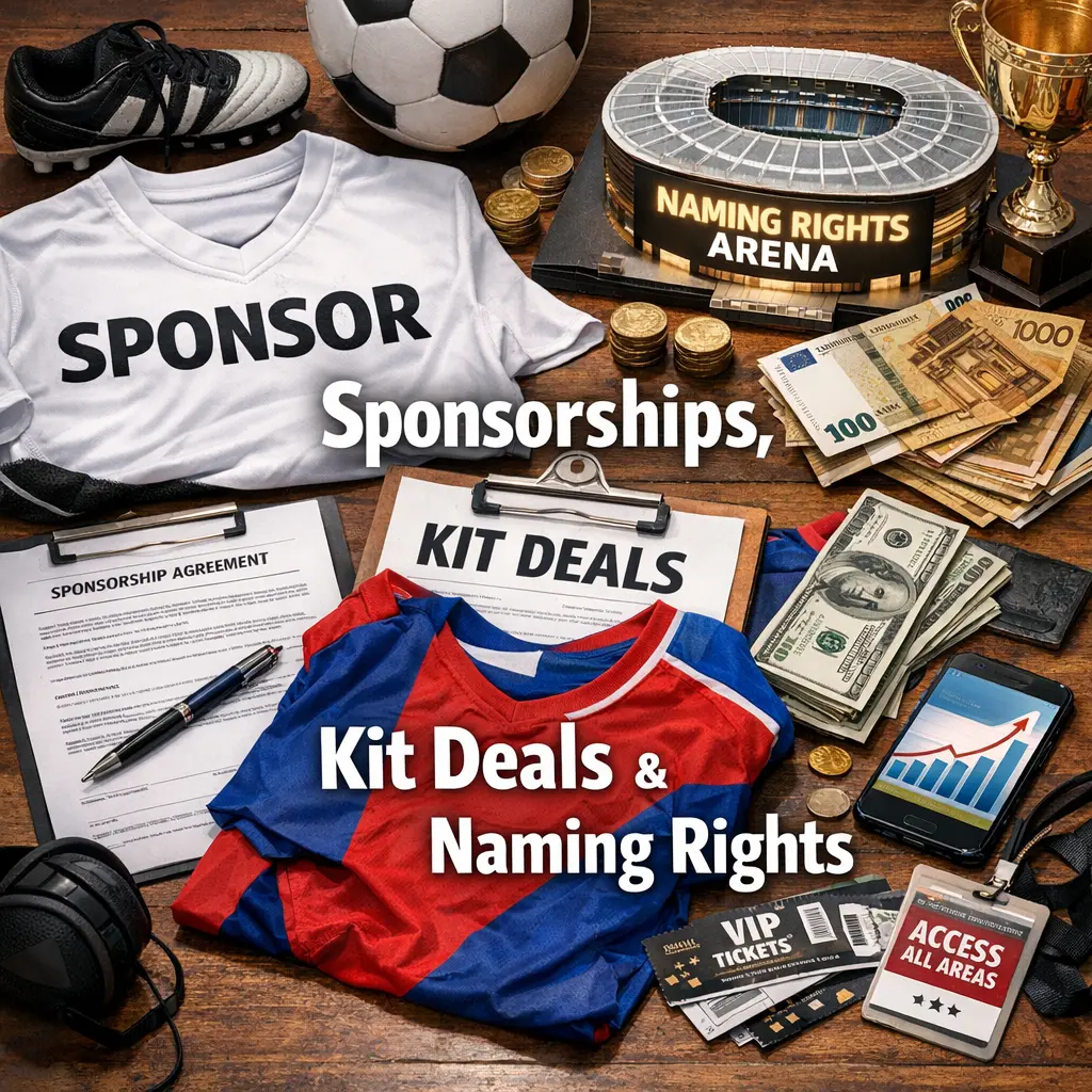 Sponsorships cover overall brand exposure and support; kit deals focus on uniforms and equipment branding; naming rights grant the right to name a venue or facility.