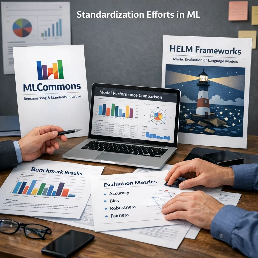 Standardization efforts in AI, such as those by MLCommons and HELM-style frameworks, aim to create consistent benchmarks and evaluation protocols for machine learning models, particularly large language models (LLMs). MLCommons develops shared datasets and performance metrics, while HELM-style frameworks focus on systematic, transparent, and comprehensive LLM evaluations (evals). Together, these initiatives promote fair comparisons, reproducibility, and transparency, fostering trust and accelerating progress in AI development and deployment.