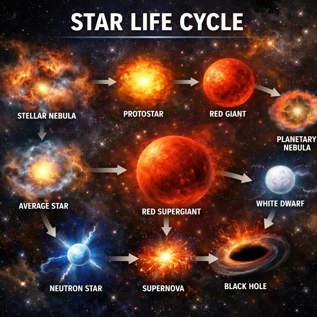 The star life cycle is the sequence from birth in a stellar nebula through stages like protostar, main sequence, post-main-sequence evolution (giant or supergiant), and finally the star's remnant fate (white dwarf, neutron star, or black hole), depending on its mass.