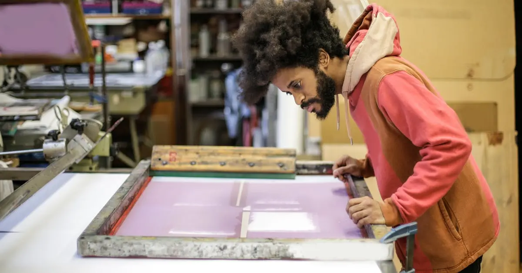 Screen printing uses a woven mesh screen prepared with a stencil. Ink is pushed through the unblocked mesh with a squeegee onto the substrate to create bold prints on fabric, paper, and more.