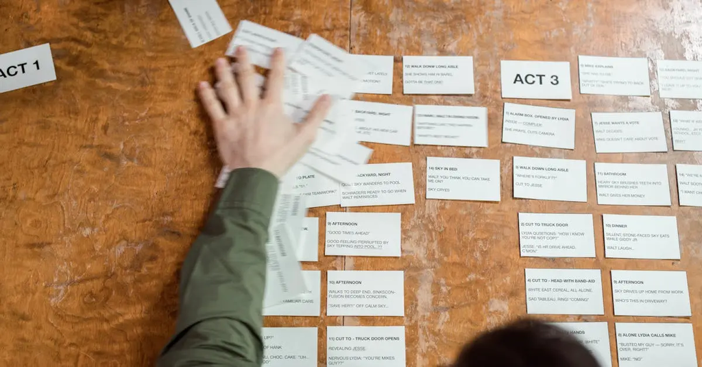 Core elements include setup (beginning), rising action, climax, and resolution, along with character arcs, pacing, and the sequence of events that connect cause and effect.