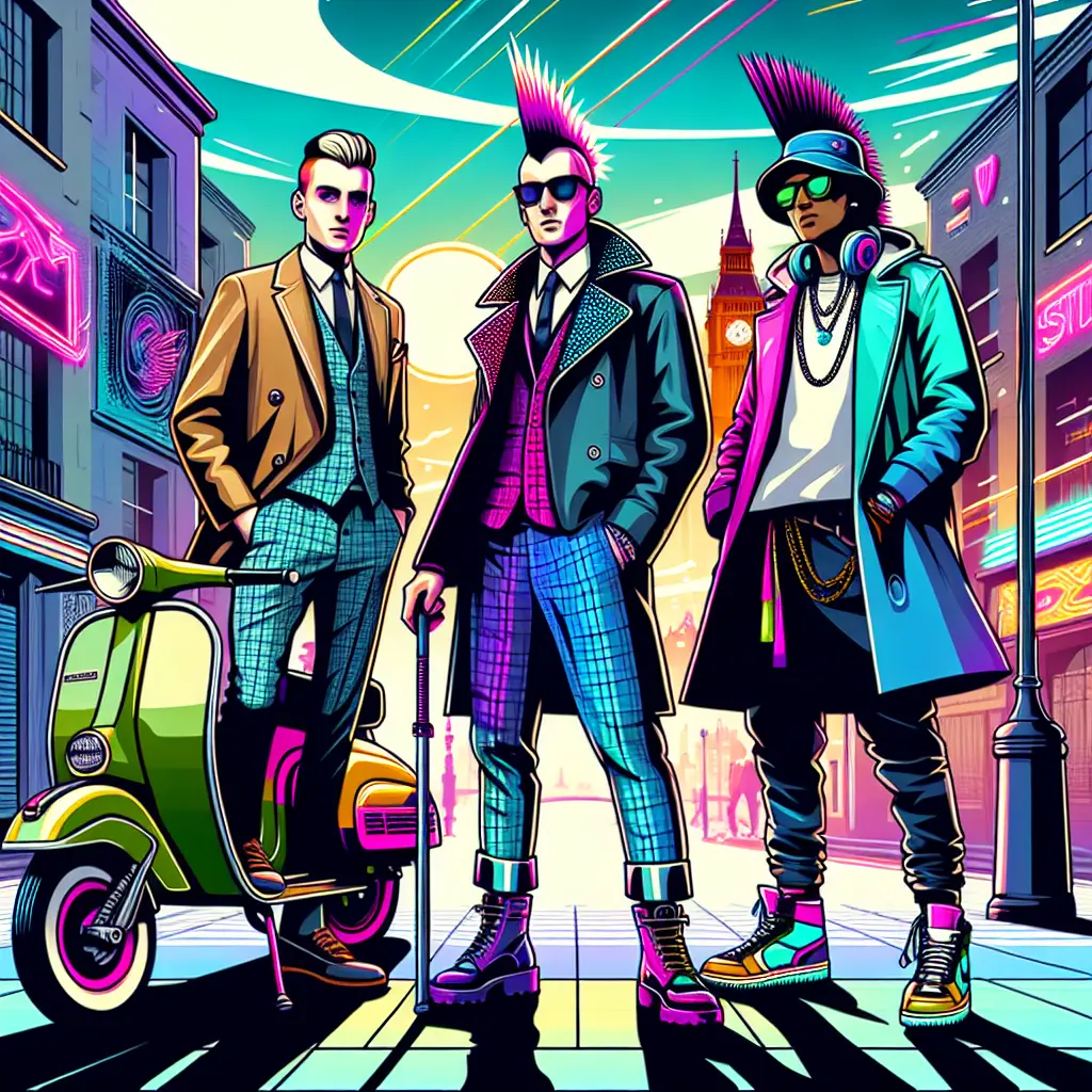 Mods: sharp suits, parkas, and clean shoes. Punks: ripped clothing, leather jackets, studs, and safety pins. Early Hip-Hop: oversized garments, sneakers, tracksuits, hats, and bold jewelry.