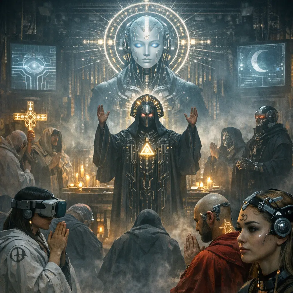 Belief systems or communities that treat technology or technological breakthroughs as sacred or spiritually meaningful, often blending religious-like rituals with tech practices around AI, the digital world, or future visions.