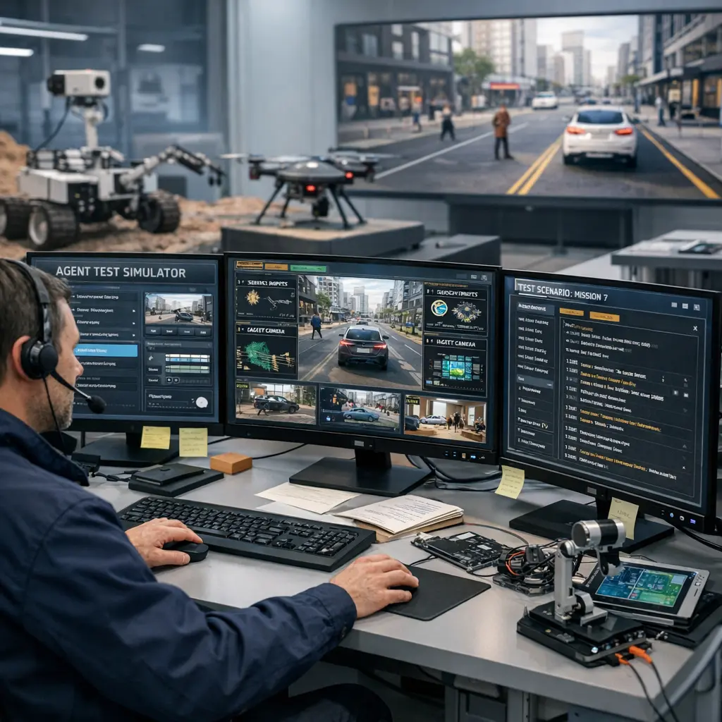 Use deterministic scenarios, maintain versioned simulator models, and contract-test agent–simulator interfaces; simulate failures, latency, and partial observability; run repeatable suites and record results.